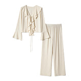 Lightweight Chic Metal Ring Drape Cowl Halter Neck Bodysuit and Elastic Waist Wide Leg Pants Set
