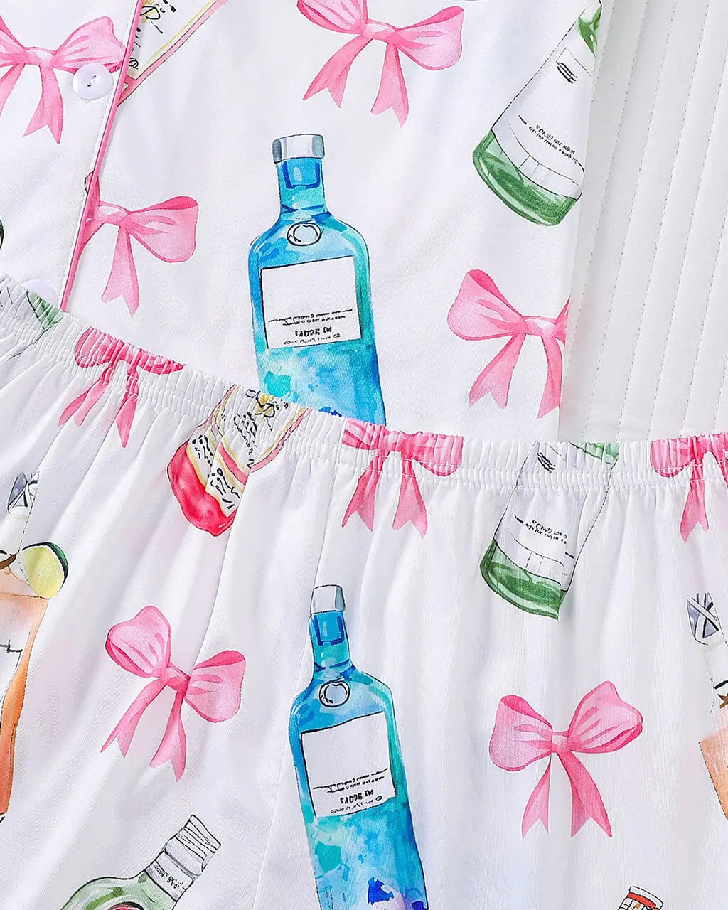 Champagne Bow Print Button-Up Pajama Set - OMFORT
