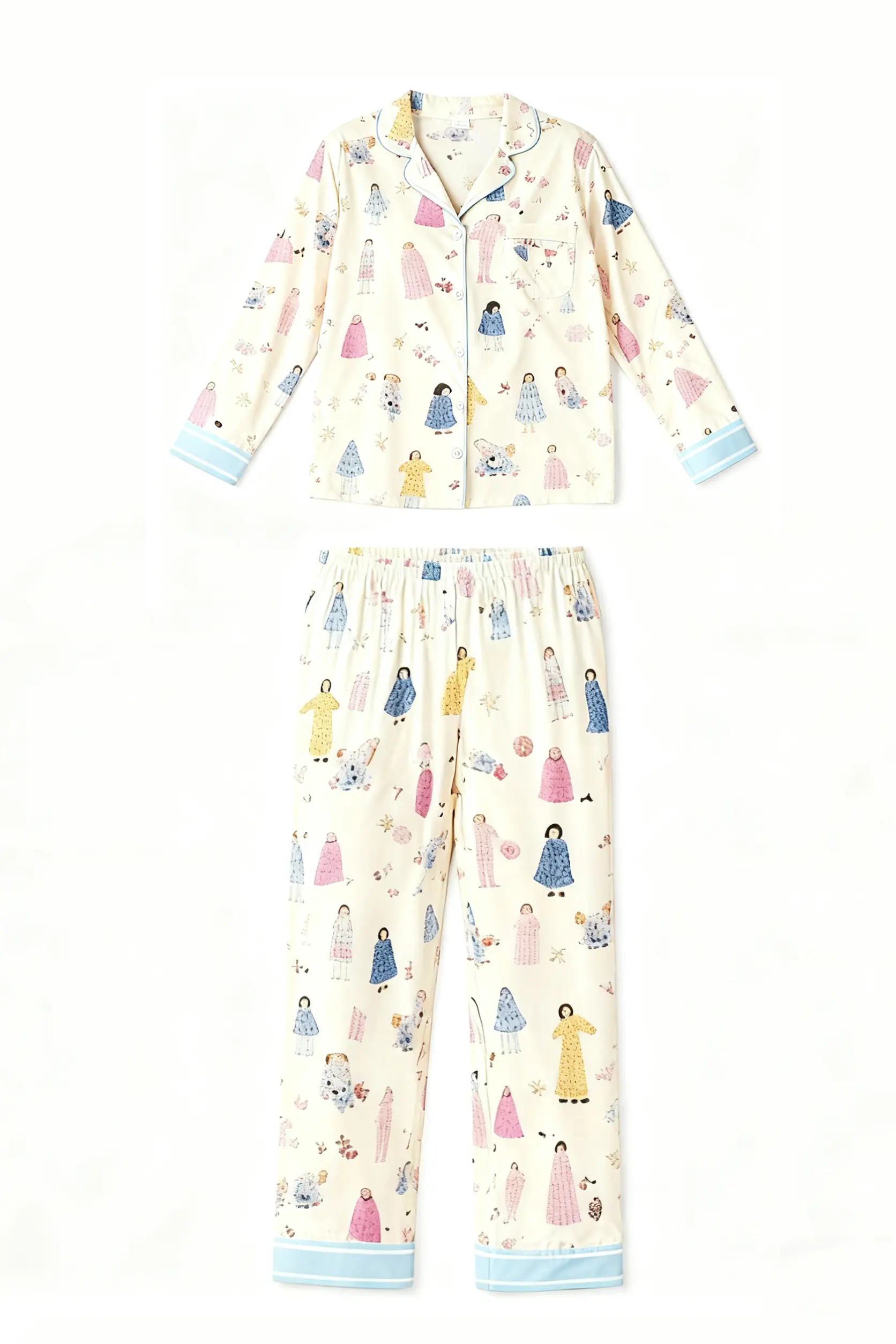 Character Print Blue Trim Lapel Pajama Set OMFORT