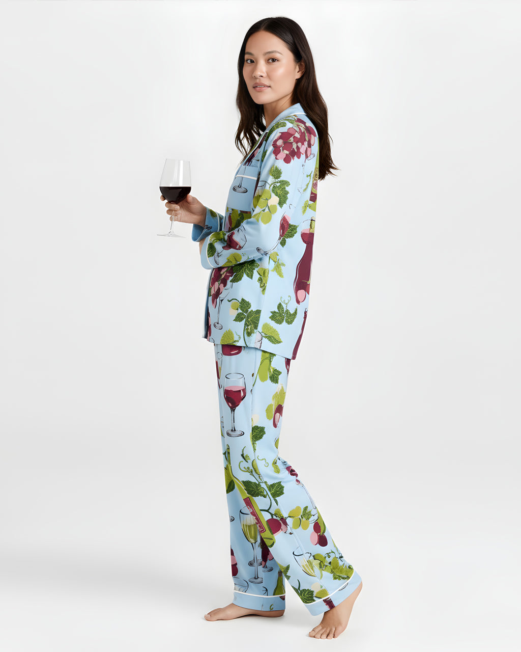 Grapes Wine Bottles Print Pajama Set OMFORT